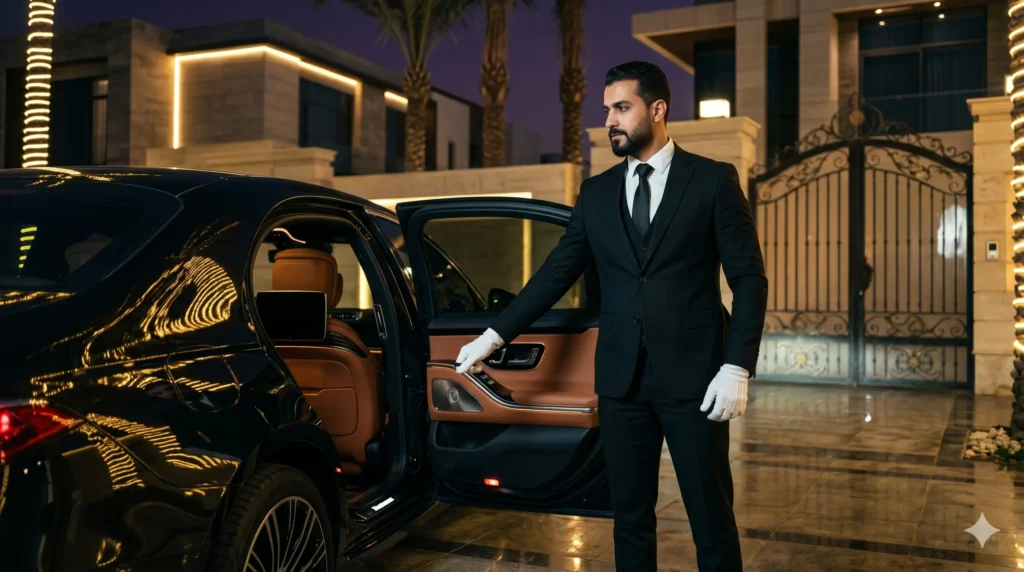 السائق ينزل من السيارة لمساعدتك في حمل الحقائب من باب البيت حتى صندوق السيارة ثم إلى عربة الأمتعة بالمطار.